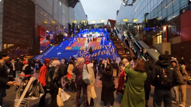 クリスマス期間中は京都駅ビル4階にある大階段で通年開催されている「大階段グラフィカルイルミネーションPlus」と呼ばれる全171段中、125段の大階段にちりばめられた約15,000個のLEDが夜の京都駅を色鮮やかに彩っています。