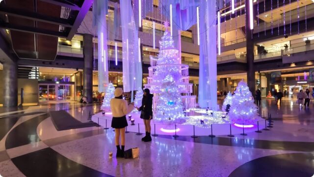 グランフロントの北館1Fナレッジプラザでは毎年クリスマスツリーが展示されており、GRAND WISH CHRISTMAS 2025のテーマが「Winter Prism」。クリスタルガラスのツリーの頭上に、オーロラをイメージした総長70mの光のベールが高さ約11mから揺らめいており、絶好のSNS映えスポットになっています。展示期間は12月25日まででしたが、2026年も恐らくクリスマスツリーが展示されると思いますので、どんなクリスマスツリーになるのか今から楽しみですね。