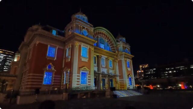 大阪市北区中之島で開催されている「OSAKA光のルネサンス2025」を中之島公園からプロジェクションマッピングが行われている中央公会堂周辺を歩いて撮影しました。