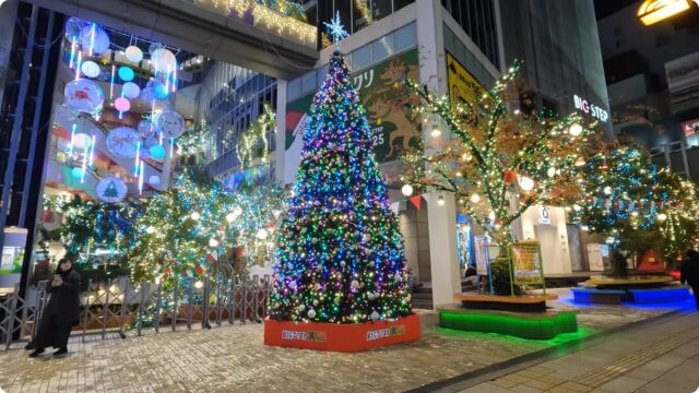 アメリカ村の中心にある心斎橋BIGSTEPでは現在「BIGSTEP Xmas 2025」として巨大クリスマスツリー(7m)やフォトジェニックな装飾(バルーン、LEDランタンなど)が展開され、館内も華やかに彩られています。残念ながら撮影した時間が遅かった為、館内の様子は撮影できませんでしたが、アメ村名物のクリスマスツリーは絶好の撮影スポットです。