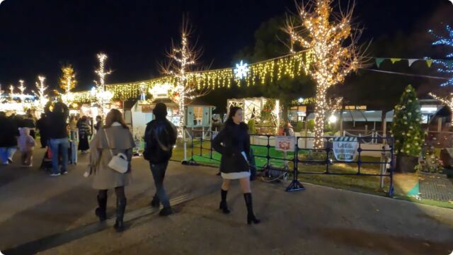 「クリスマスマーケット」とは、クリスマスまでの約4週間、ドイツをはじめヨーロッパ各地で開催される伝統的なお祭りで、「てんしば」でのクリスマスマーケットも恒例となり、2025年は11月28日(金)~12月25日(木)の期間開催されていました。会場内では飲食ブースをはじめ、スノードームをはじめとしたワークショップつくりや、クリスマス商品の販売、様々なイベントやパフォーマンスなどの催しが行われており、撮影した日は平日の夜でしたが、カップル、ファミリー、友達同士など多くの人で賑わってました。